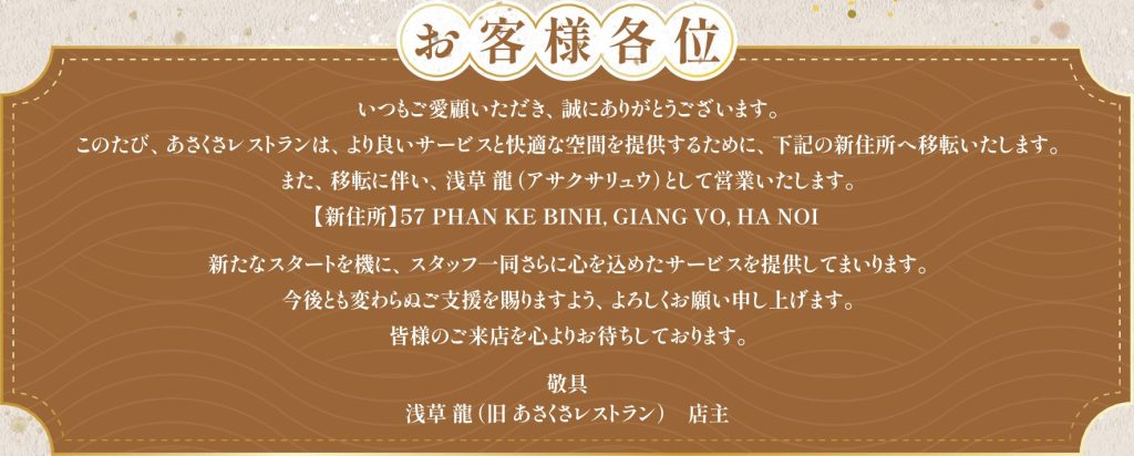 | 名称 | あさくさレストラン/Nhà Hàng Asakusa |