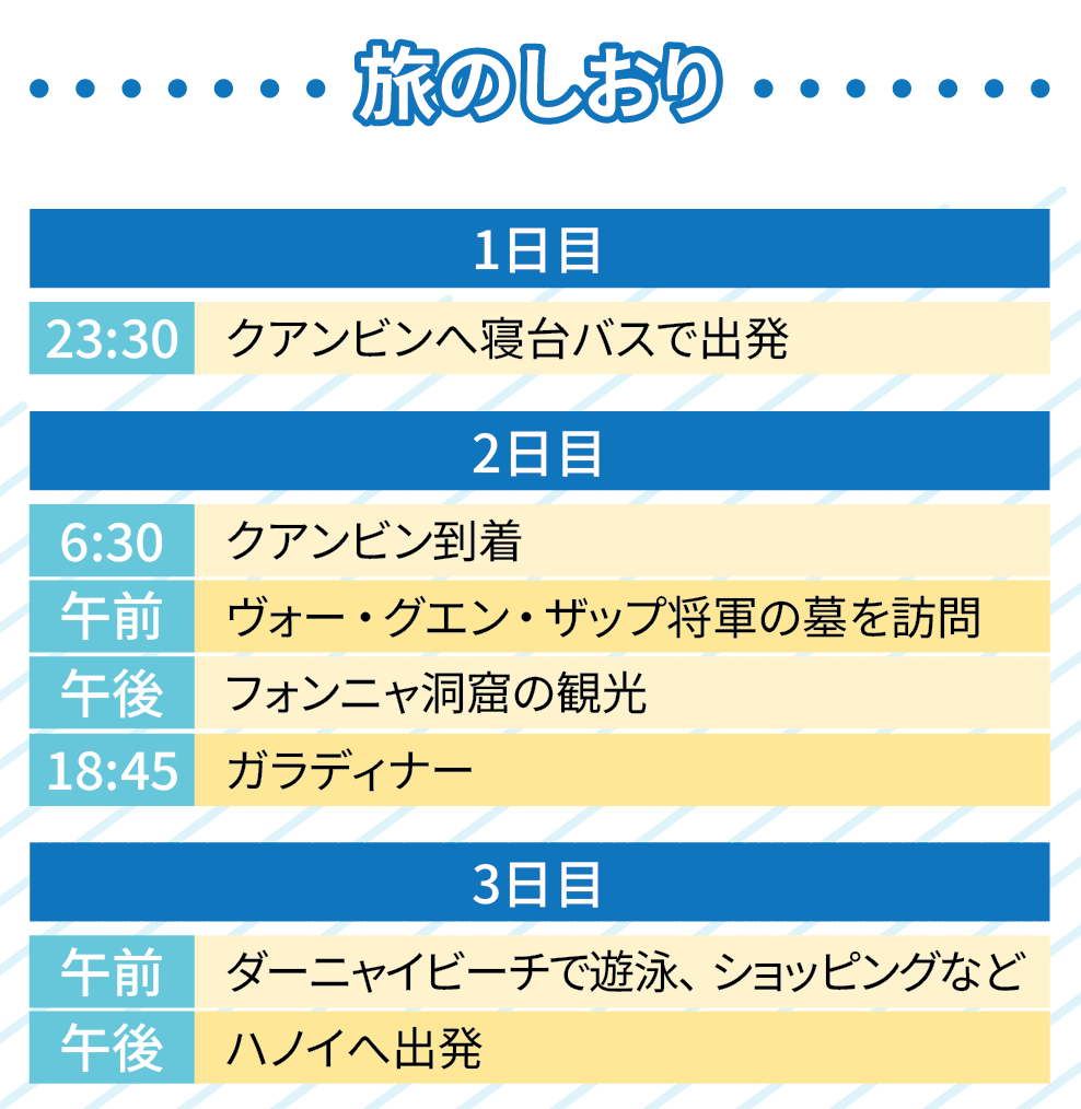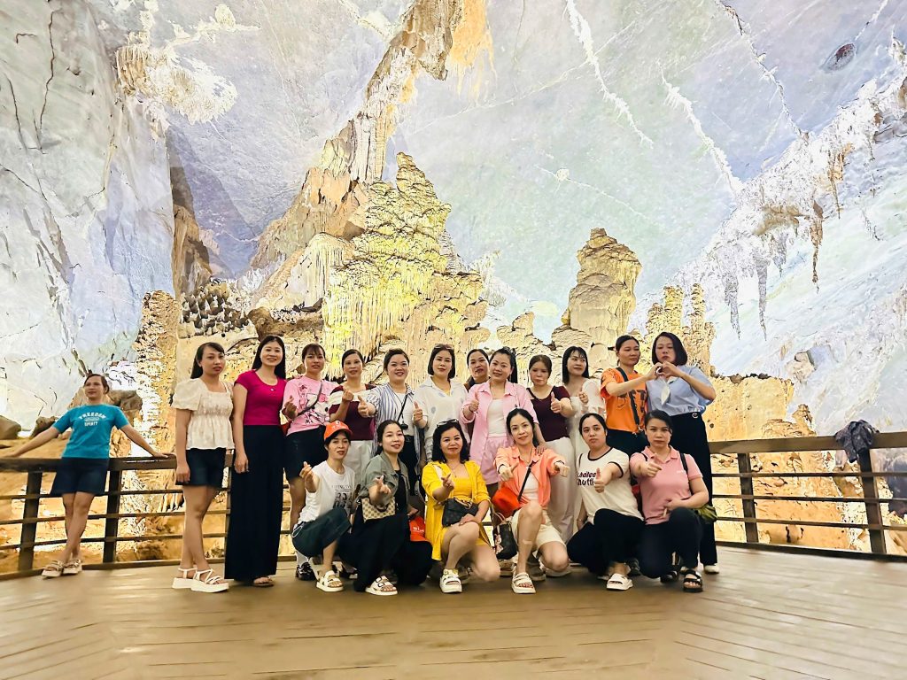 2025年の行き先は、飛行機で行くには近く、バスで行くには遠い、絶妙な距離のところにあるクアンビン(Quang Binh)省となったため、23時に会社へ集合し、夜行バスで出発しました。宿泊したホテルはダーニャイ(Da Nhay)ビーチの目の前にあり、プールやジム、カフェも完備されていました。観光はフォンニャ(Phong Nha)洞窟や岩場の景勝地バイダーニャイ(Bai Da Nhay)を訪れ、思いっきり自然を満喫しました。