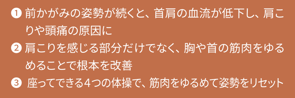 しかし実際は、私たちが肩こりを感じる肩の付け根から肩甲骨まわりの筋肉(僧帽筋上部線維)そのものに原因があるわけではありません。むしろ、胸の筋肉(大胸筋・小胸筋)や後頭部の筋肉(後頭下筋群)が縮んで硬くなることで姿勢が崩れ、その結果として僧帽筋上部線維が引き伸ばされ、張ってしまうのです。これは上位交差症候群と呼ばれ、姿勢バランスの崩れが肩こりの本質的な要因です。 改善のポイントは、縮んでしまった筋肉をゆるめて、正しい姿勢にリセットすること。ここでは座ったままでもできる簡単な体操を4つ紹介します。