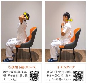 しかし実際は、私たちが肩こりを感じる肩の付け根から肩甲骨まわりの筋肉(僧帽筋上部線維)そのものに原因があるわけではありません。むしろ、胸の筋肉(大胸筋・小胸筋)や後頭部の筋肉(後頭下筋群)が縮んで硬くなることで姿勢が崩れ、その結果として僧帽筋上部線維が引き伸ばされ、張ってしまうのです。これは上位交差症候群と呼ばれ、姿勢バランスの崩れが肩こりの本質的な要因です。 改善のポイントは、縮んでしまった筋肉をゆるめて、正しい姿勢にリセットすること。ここでは座ったままでもできる簡単な体操を4つ紹介します。