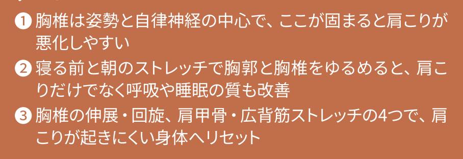 今回は、寝る前や朝一番におすすめしたい「胸椎をリセットする4つのストレッチ」を紹介します。座った姿勢では届きにくい胸郭の伸展や胸椎の回旋を、寝た姿勢でゆったりとした呼吸とともに行うことで、深層のこわばりがほぐれ、副交感神経がはたらきやすくなります。その結果、首と肩の緊張が自然と抜け、肩こりの軽減だけでなく、睡眠の質の向上や朝のスッキリ感にもつながります