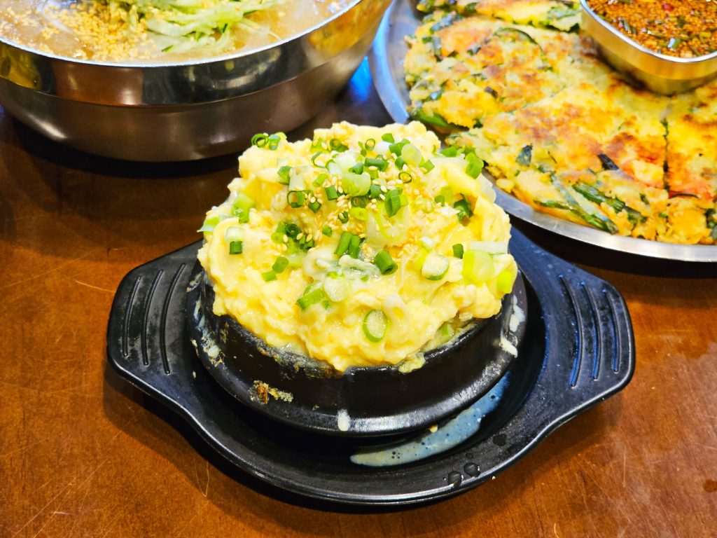 韓国土鍋トゥッペギに溢れんばかりにたっぷり入った蒸し卵は、ふんわりとした食感と口の中でとろける優しい甘みが魅力です。シンプルながらも出汁の旨味が卵全体に染み渡り、アツアツのまま最後まで楽しめます。まるで雲のように軽やかでなめらかな口当たりと、長く残る温もりが食卓に調和をもたらし、心に残る存在感を放ちます。