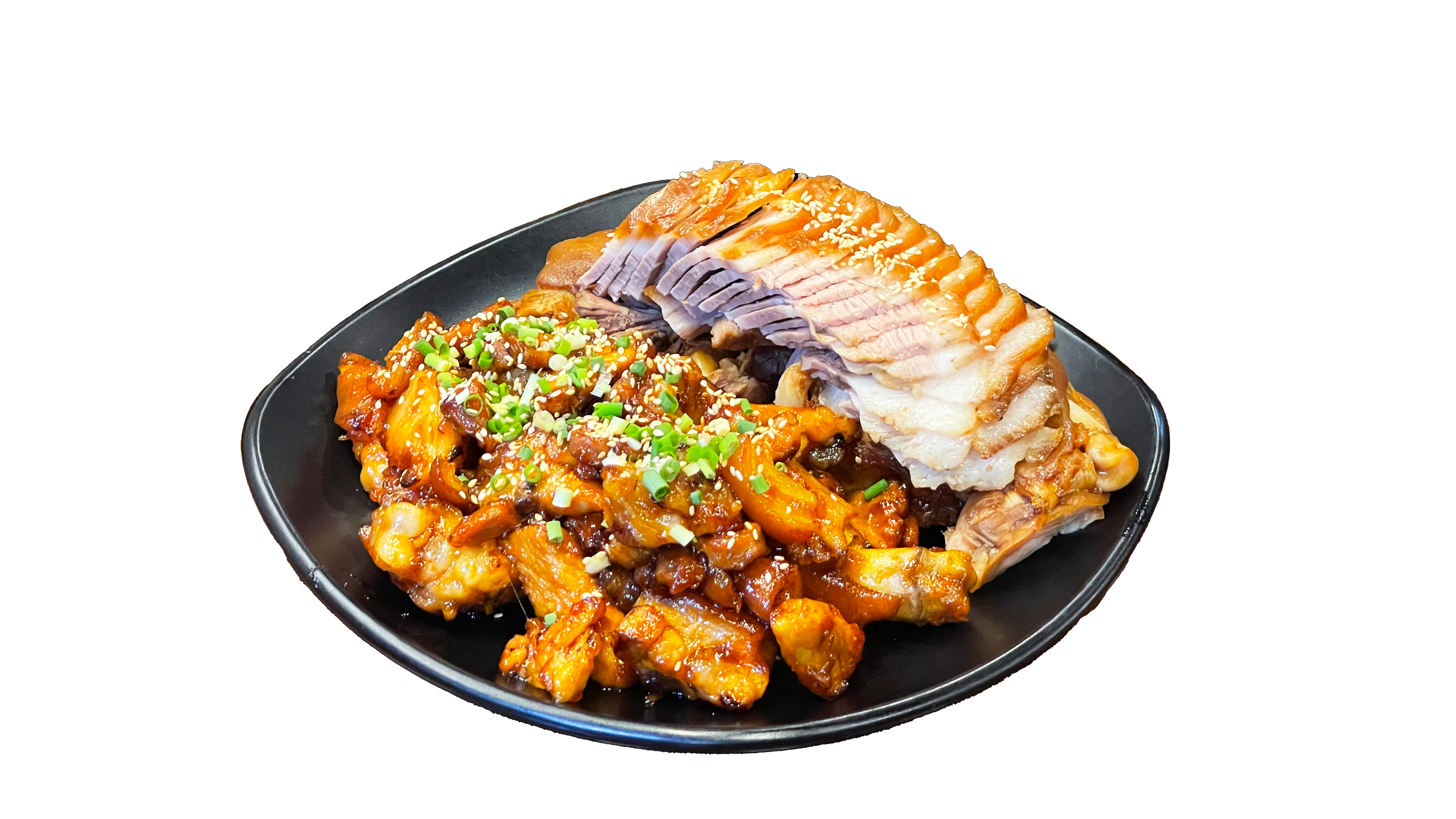 豚足の2種盛りは、それぞれ異なる味と食感が楽しめます。漢方豚足は薄くスライスされ、醤油ベースの味付けが香ばしく、シナモンなどの漢方薬を取り入れていることでほのかな甘みも広がります。火豚足は、厚みのあるカットで肉の弾力をしっかり感じられ、程よい辛さがアクセントに。サンチュや特性ダレ、キムチとの相性も抜群です。