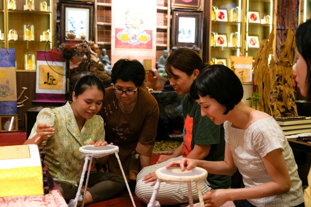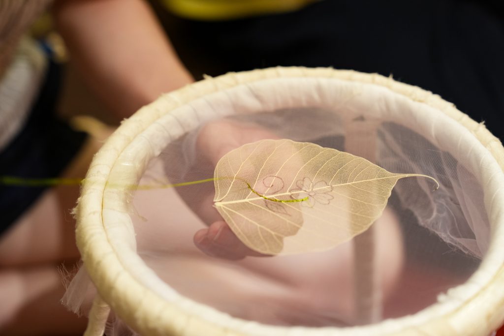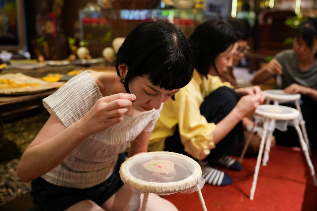 ホアルー旧市街にあり、同地ならではの伝統美と静けさを体感できる特別な空間です。店内には、希少な菩提樹の葉を使った手工芸品が並び、その繊細さに目を奪われます。中でも人気なのが、自ら刺繍を施す体験。石灰水に漬けて葉脈だけを残した葉に、蓮や動物、伝統模様を絹糸で一針ずつ縫っていきます。初めてでも職人が丁寧にサポートしてくれるため、自分だけのアートを形にできます。