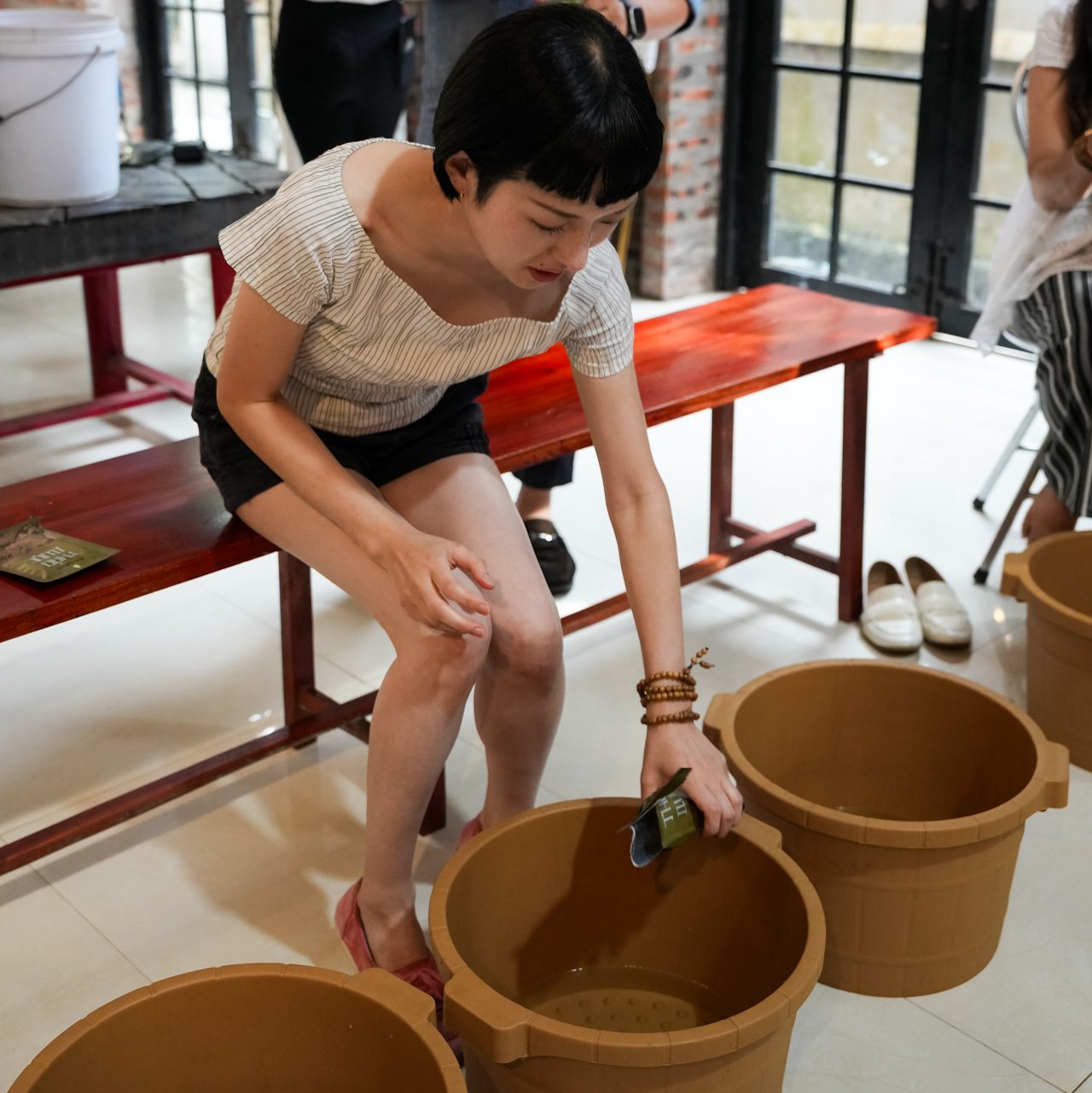体験の合間は、薬草足湯に入ることができます。地元産の生姜やレモングラス、シナモンなどを煮出した薬湯に足を浸すと、旅の疲れがじんわりとほぐれていきます。身体を芯から温めることで、血行促進やリラックス効果が期待できるだけでなく、香りでも癒されていきます。