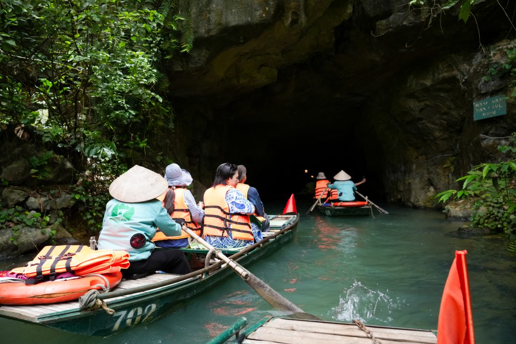 同地での醍醐味は、手漕ぎボートで巡る約2~4時間の川下りです。その途中で、トリン(Trinh)祠堂、チャン(Tran)王祠、バージョット(Ba Giot)洞窟、ナウルオウ(Nau Ruou)洞窟など、由緒ある祠堂や幻想的な洞窟にも訪れることができます。ボートの定員は4~5人。穏やかな水面を進んでいく中、石のアーチや鍾乳洞をくぐる体験は、まるで冒険物語の1シーンに入り込んだような気分を味わえます。