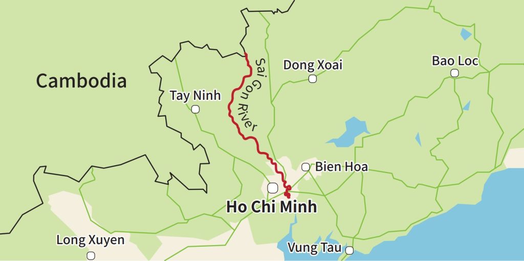 サイゴン川の全長はおよそ256km。ビンフオック(Binh Phuoc)省のロックニン(Loc Ninh)郡にあるラーチチャム(Rach Cham)地区を源流とし、タイニン(Tay Ninh)省、ビンズン(Binh Duong)省を経てホーチミン市の中心部を通り、最後はナーベー(Nha Be)地区にあるドンナイ(Dong Nai)川へと合流します。
