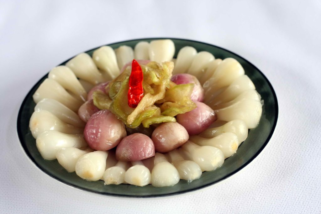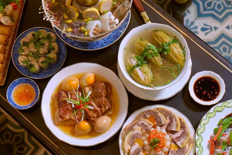 食文化にも、南部らしい特徴が見られます。正月料理の中心となるのが、円筒形のバインテト。もち米を使った餅料理で、家族の団らんや豊かさを象徴する存在として親しまれています。さらに、豚肉と卵をココナッツウォーターで煮込んだ「ティット・コー・タウ(Thit Kho Tau)」や、苦瓜の肉詰めスープなど、縁起を担いだ料理が食卓に並びます。油分の多い料理には、らっきょうの甘酢漬けを添えるのが定番です。