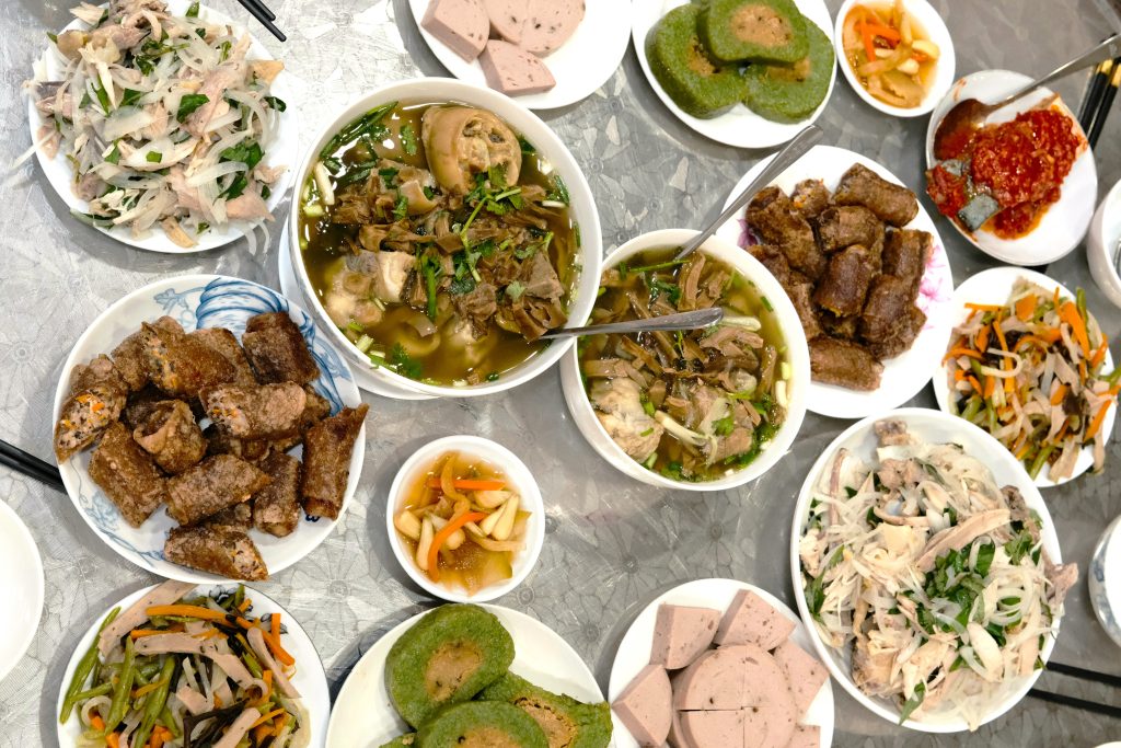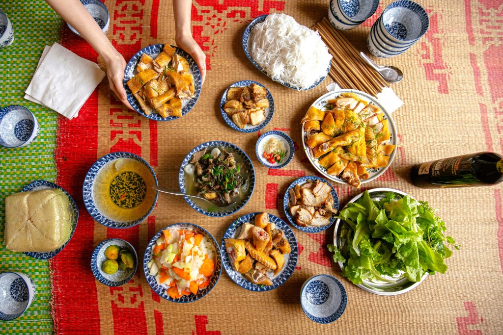 食文化も、北部のテトを特徴づける大切な要素です。代表的なのが、四角い形をしたバインチュン。土地や大地を象徴するとされ、家族の繁栄を願う意味が込められています。塩漬け野菜や煮物など、素朴で保存性の高い料理が多いのも北部ならではです。