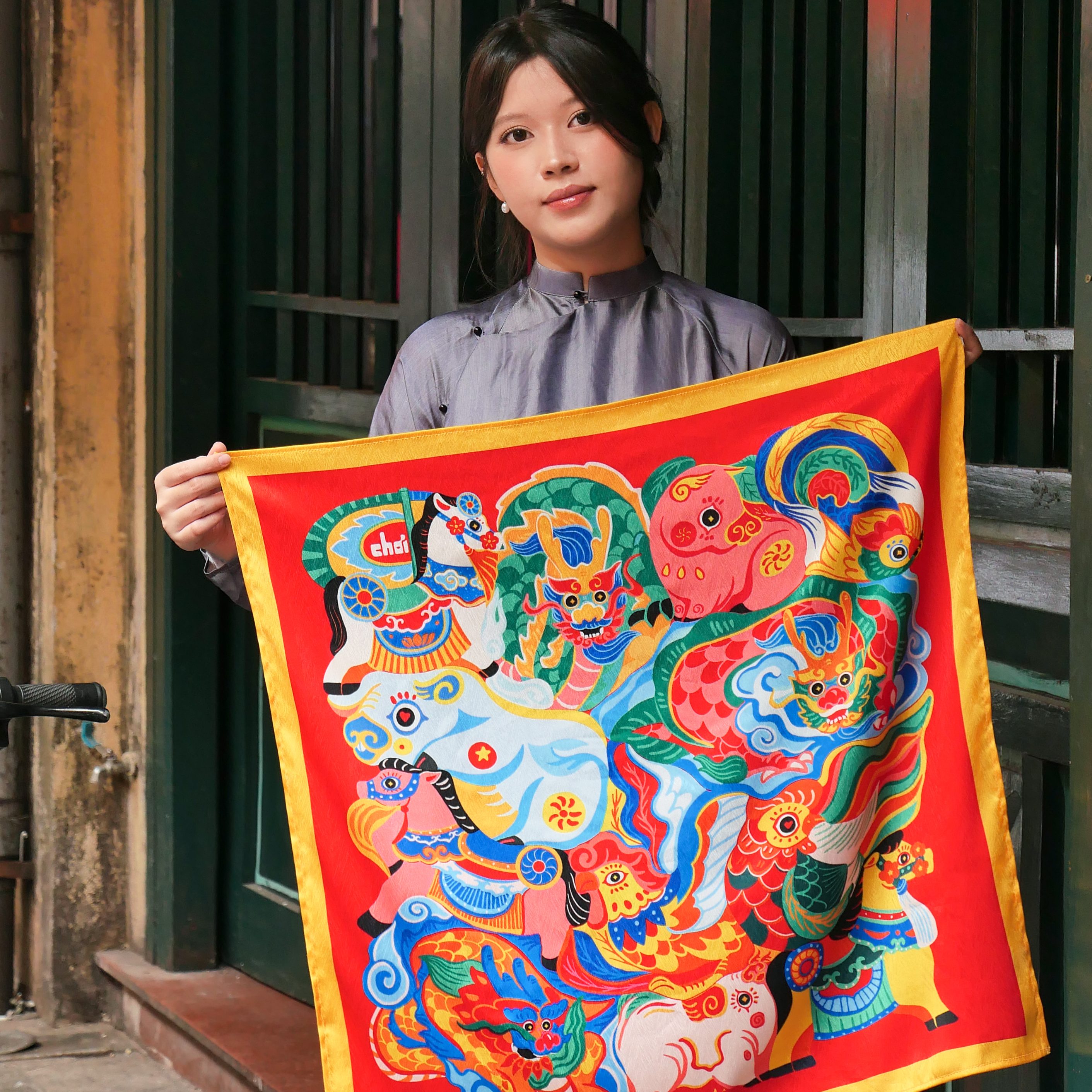 現在展開しているのは、伝統演劇の隈取りから着想を得た「古都の劇」、民画を現代的に解釈した「ハン・チョン絵画(Tranh Hang Trong)」、そして伝統舞台と現代の街角を重ねた「ステージ」の3つのコレクション。いずれもベトナムの精神性を鮮やかに映し出しています。
