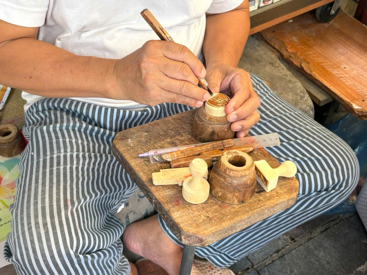 ハノイ旧市街にある老舗のはんこ屋「フックロイ」では、希望の似顔絵や名前を刻んだオーダーメイドのはんこを制作してくれます。店前に並ぶサンプルを眺めながら、自分だけのオリジナルデザインを考える時間さえも心が躍ります。