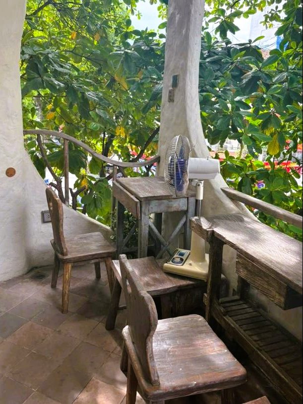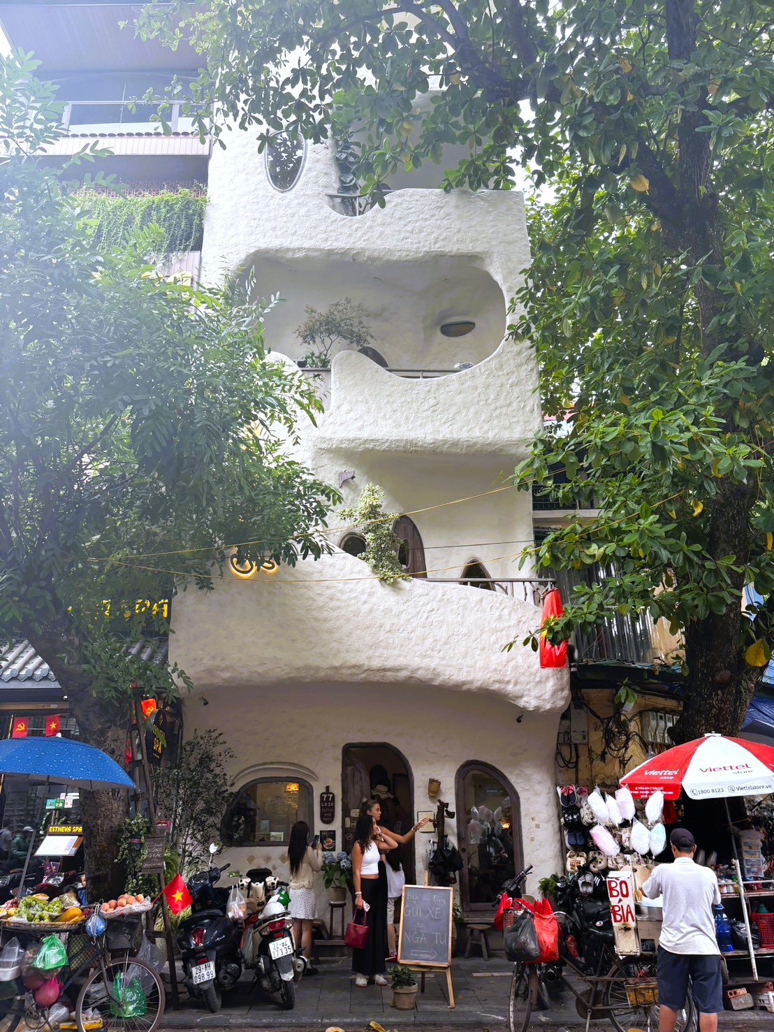 ホアンキエム湖から東側へ5分ほど歩いたところにあるコーヒー店。周囲のカラフルな建物や屋台とは異なり、同店は白色を基調としており、丸みを帯びた縁取りが織りなす柔らかなフォルムは、まるでおとぎ話の世界に迷い込んだかのような気分を味わえる外観です。壁や窓だけでなく、外に張り出したバルコニーも曲線を描くように設計されており、建物全体が統一感のある美しさを放っています。 そのユニークな佇まいは街並みに溶け込みつつも、歩く人を思わず立ち止まらせる魅力があります。