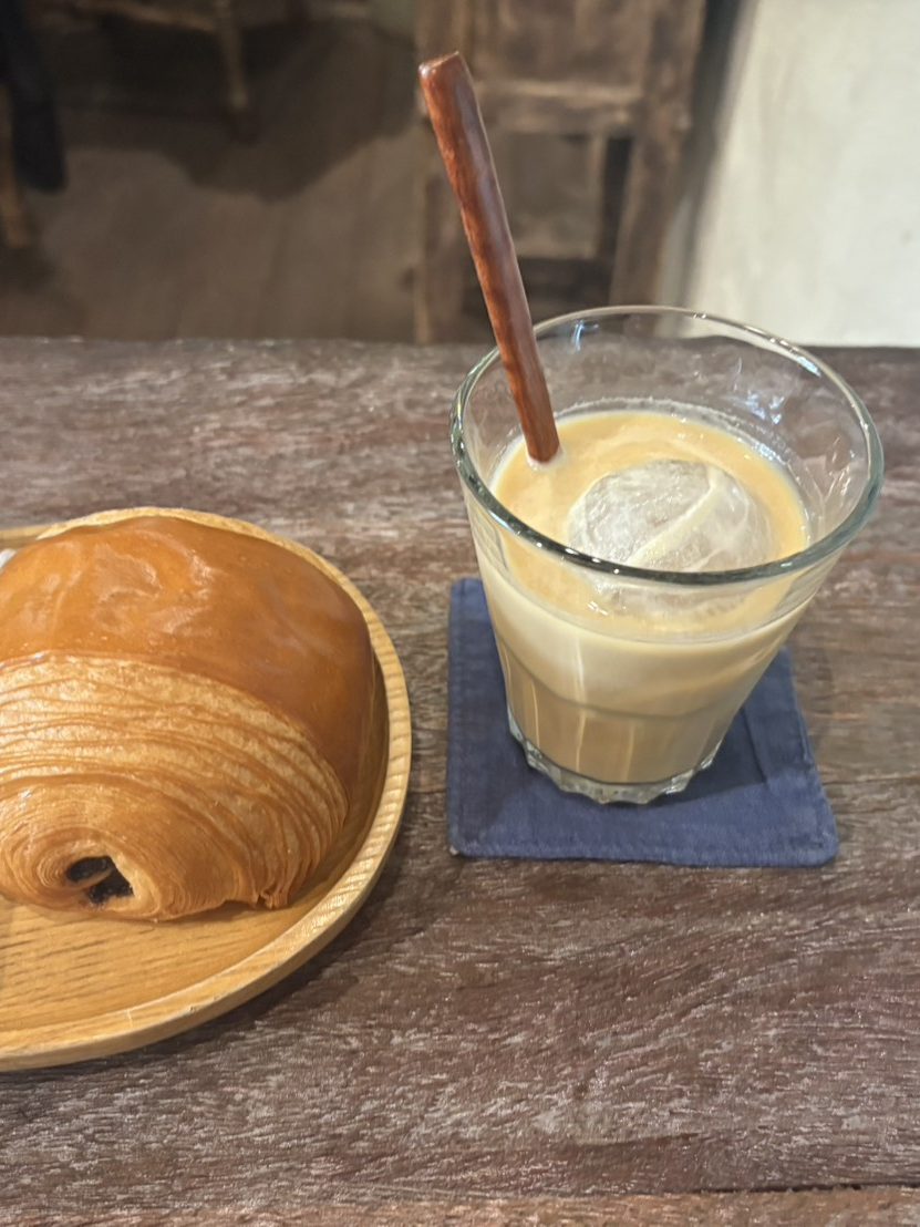 クリーミーな「ホワイトコー ヒー」(6万5000VND) と、サク サクの「パンオショコラ」(5万 5000VND) の組み合わせが好評
