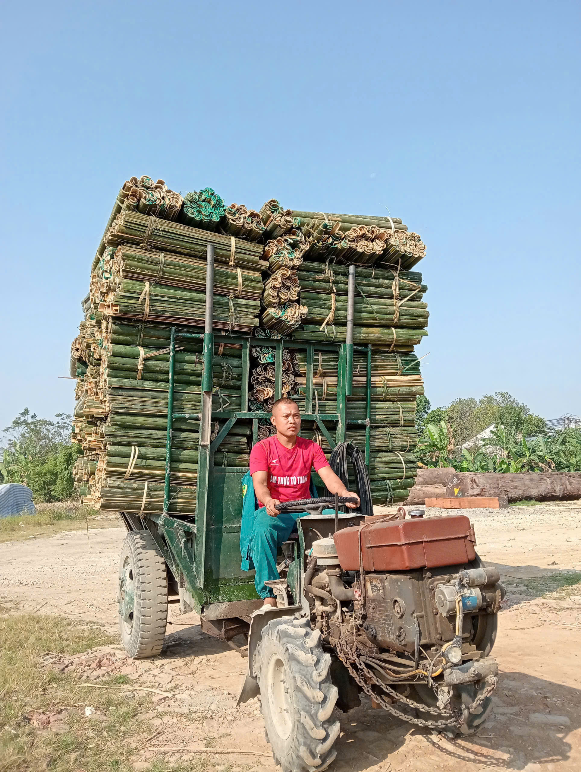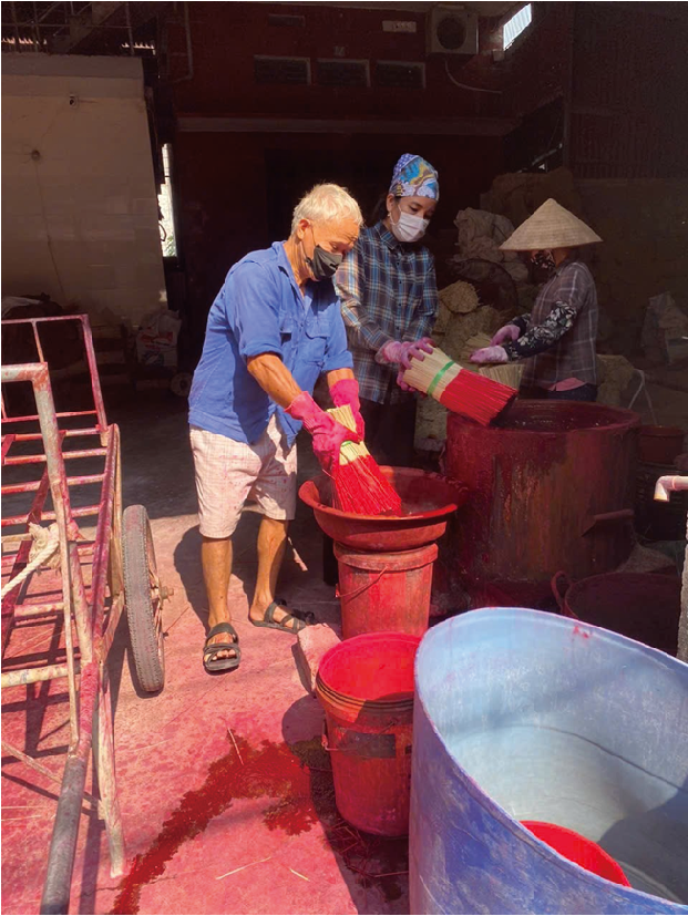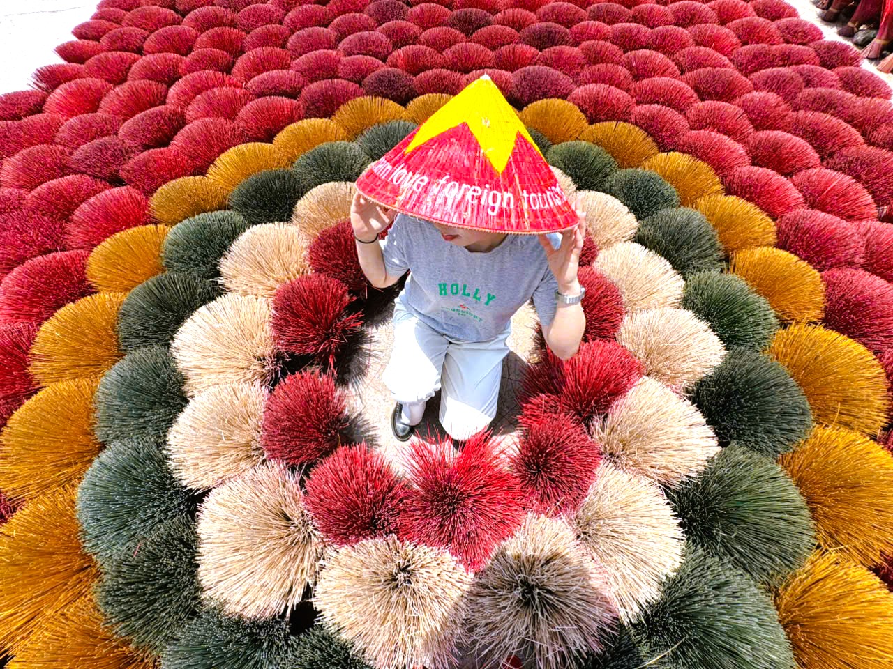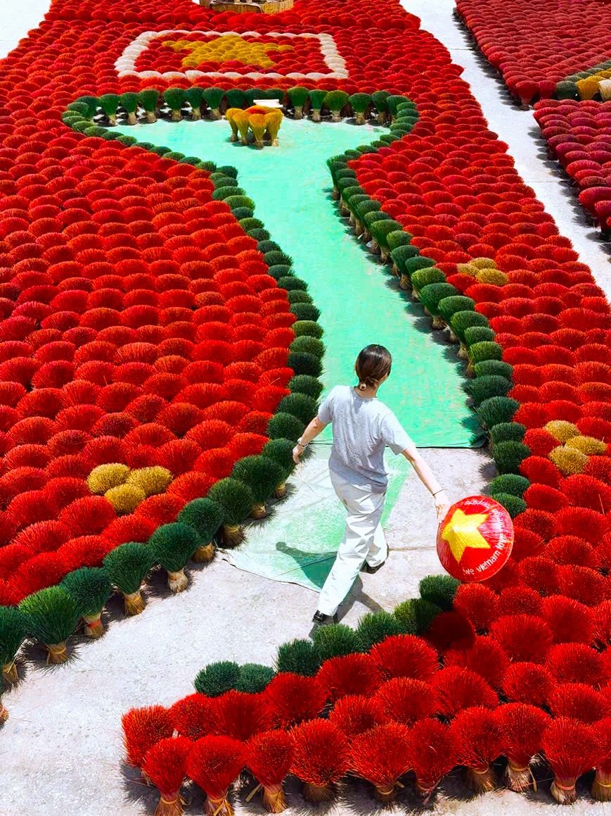 クアンフーカウ村に到着すると、道端や軒先などあらゆるところで鮮やかに色付けされた線香が並んでいます。しかし、観光客向けに公開している工房は数えられるほどしかありません。村内には撮影スポットが用意されており、そこへの入場料は1人5万VND。内部には写真撮影用の脚立や足場、椅子などが用意されています。追加で10万VNDを支払うと、スタッフがポーズや撮影場所を提案してくれるほか、より多くの写真や動画を撮影できるようになります。