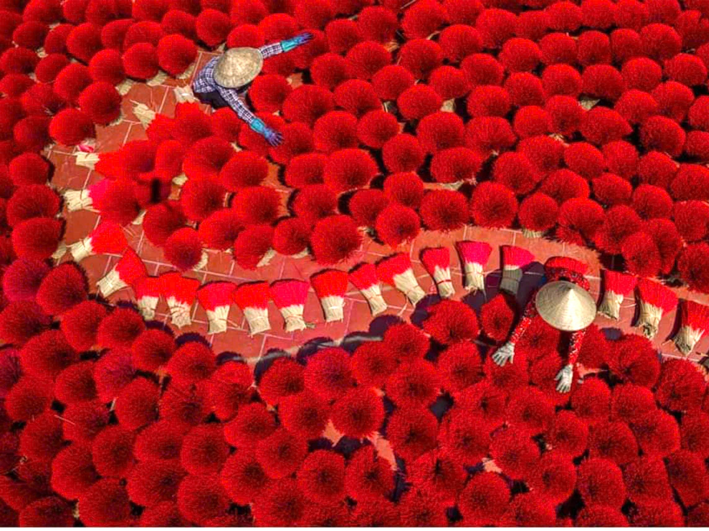 ハノイ市内中心部から南へ約35kmのところにあるクアンフーカウ村は、伝統的な線香を製造している場所として知られており、線香村とも呼ばれています。カラフルな色に染められた線香を扇状に広げて乾燥させている光景は、まるで村人たちの手仕事が生み出す1種のアート作品のようです。