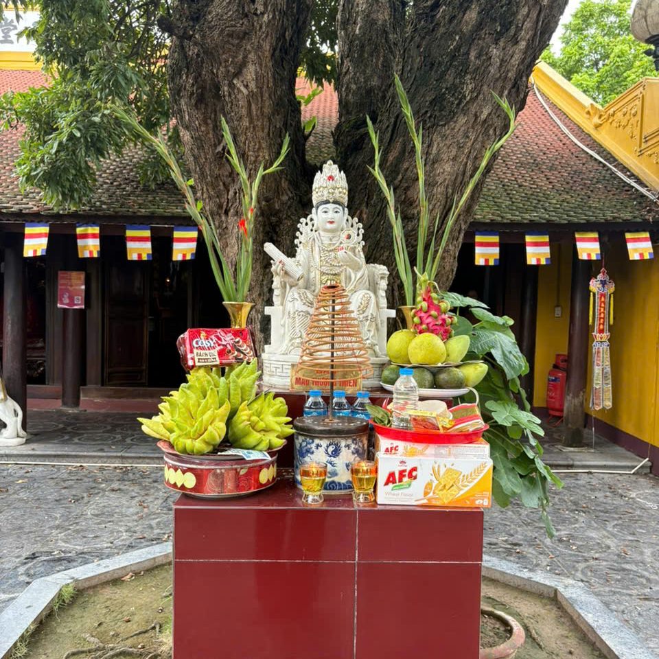 慈悲を象徴する観音菩 薩 像。今もなお供え物が丁寧に手向けられている