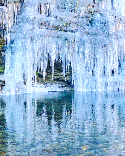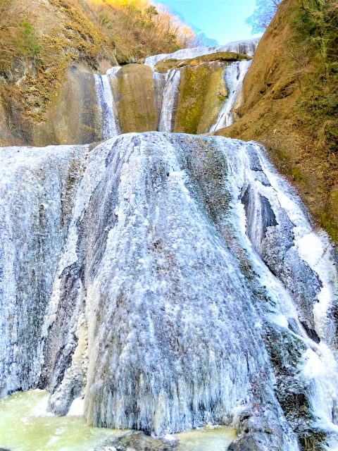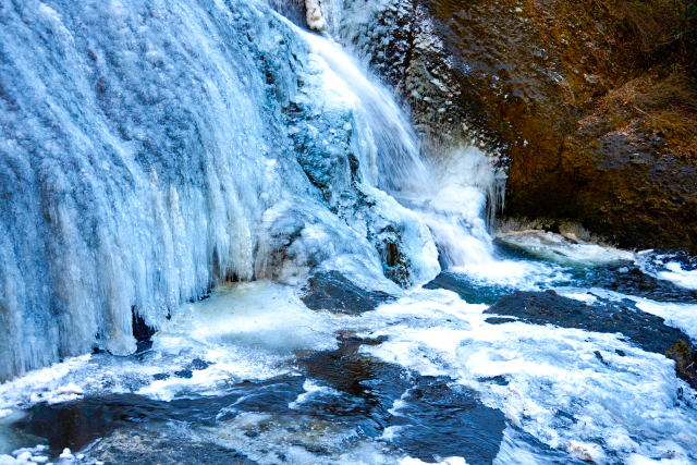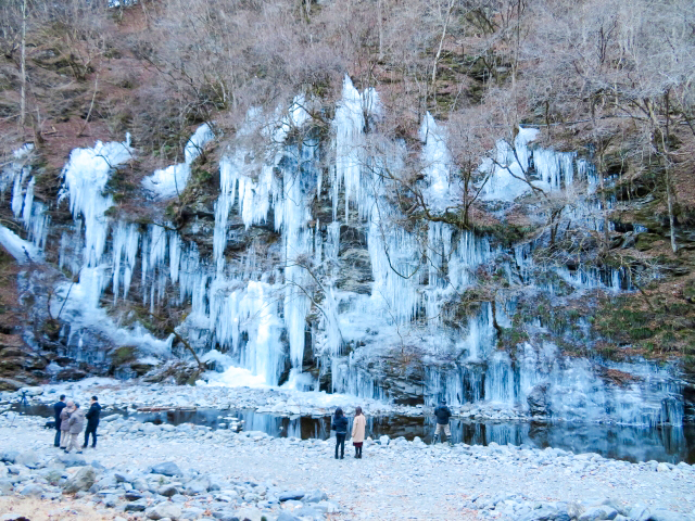 氷瀑とは、凍った滝のことです。袋田の滝の高さは120メートル。30階建てのビルと同じくらいの高さの滝が、真冬になると凍結します。最近は、温暖化の影響で、全面凍結することが少なくなってしまいました。日本三名瀑といわれる大きな滝を凍らせるとは。恐るべき自然の力です。