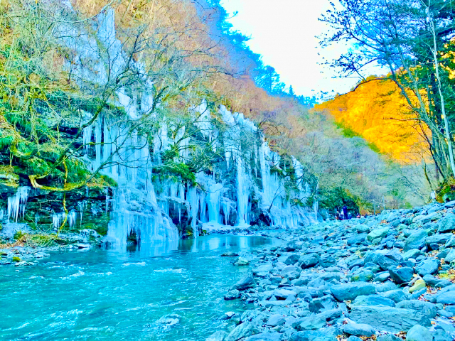 高さ10メートル、幅50メートルもある天然の氷柱です。この氷柱は、湖畔の水が岩の間を流れ出て、凍りついたもの。長い時間の中で溶けて凍るを繰り返したことで、透明度の高い氷柱ができます。夜になるとライトアップされ、まるで異世界を目にしているかのようです。