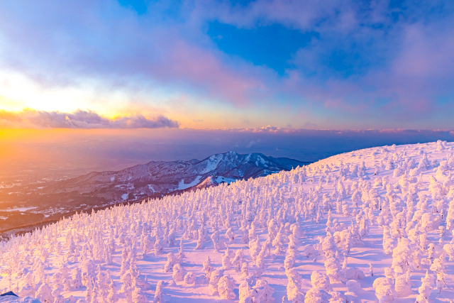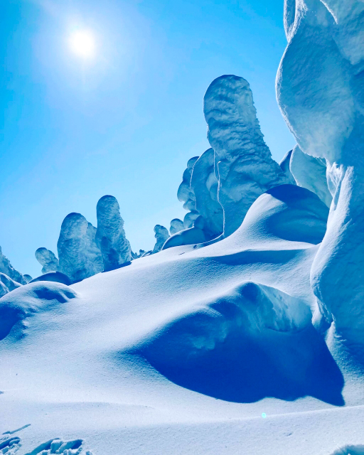 この虚像の正体は樹氷。蔵王の樹氷は、アオモリトドマツという針葉樹が雪と氷に覆われてでできており、2月に最大の大きさになります。ナイトクルーザー号に乗ると、夜のスノーモンスターに出会えます。2メートル以上の怪物の群れが全て同じ方向を向いている光景には、圧倒されます。