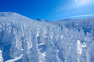 この虚像の正体は樹氷。蔵王の樹氷は、アオモリトドマツという針葉樹が雪と氷に覆われてでできており、2月に最大の大きさになります。ナイトクルーザー号に乗ると、夜のスノーモンスターに出会えます。2メートル以上の怪物の群れが全て同じ方向を向いている光景には、圧倒されます。