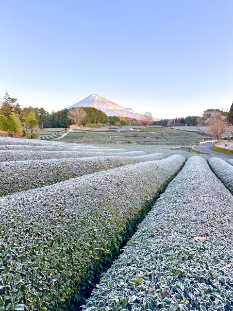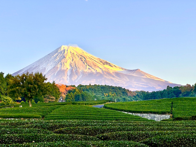 静岡県富士市の今宮・大淵笹場は、絶景の茶畑と富士山の撮影スポットとして有名です。色鮮やかな茶畑の中で、日本の象徴である富士山の大きな姿が見えます。静岡県内のこの美しい場所は、カメラ愛好者には外せないスポットです。