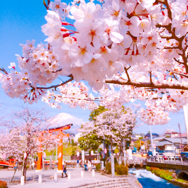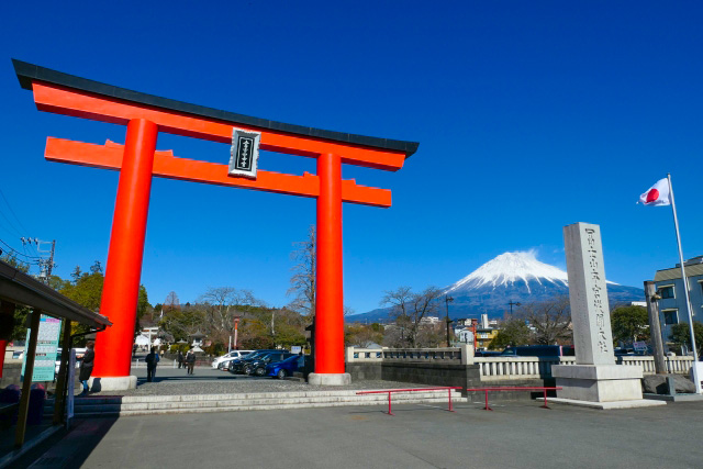 1,300余に及ぶ浅間神社の総本宮であり、東海地方最古の社。大噴火した富士山の霊を鎮めるため、浅間大神を祀ったのが起源です。朱塗りの大鳥居越しに、富士山が映えます。
