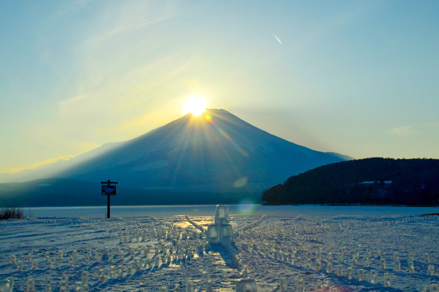 「ダイヤモンド富士」と呼ばれる、富士山頂に太陽が沈む現象が見られるスポット。富士山に一番近く、周囲をなだらかな山々に囲まれた明るい湖です。リゾート地としても有名で、キャンプやハイキング、魚釣りなども楽しめます。